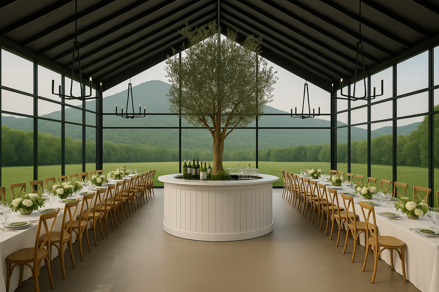 Our signature glass house is the heart of the property — a light-filled, architectural space designed to bring the outdoors in. With floor-to-ceiling glass walls and panoramic views of the surrounding mountains, fields, and gardens, it allows your guests to feel connected to nature in every season. Sunlight pours in during the day, sunsets paint the horizon in the evening, and at night the stars become part of the décor. Whether it’s dressed in lush florals or left open and airy, the glass house is a one-of-a-kind setting where every moment feels timeless and unforgettable.